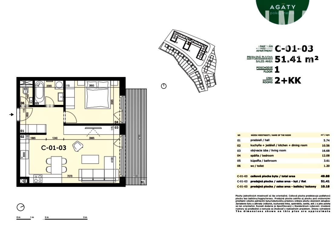 Celková výmera je 60 m2, z toho vnútorná výmera bytu 49,88 m2 + veľká loggia 10,18 m2, , NOVOSTAVBA, kolaudácia 10/2025.
