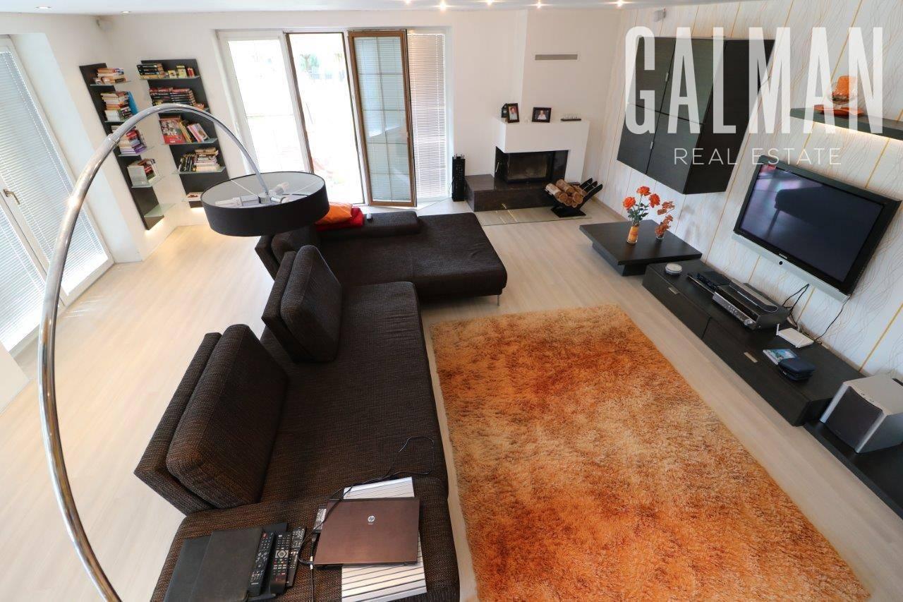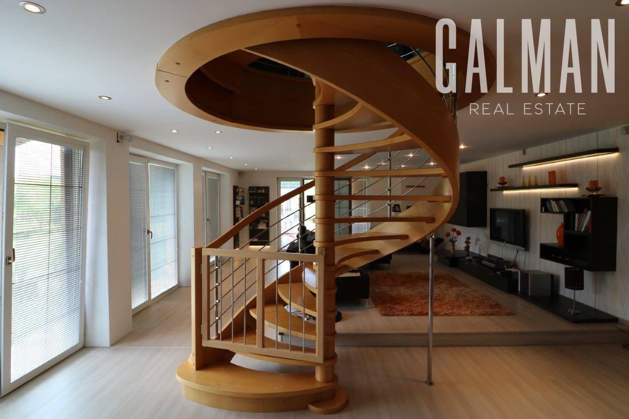 vstupný priestor, priestranná kuchynská časť- kuchynská linka na mieru so vstavanými spotrebičmi a priestorom na jedálenskú časť, veľká presvetlená obývacia izba s krbom a východom na vonkajšiu terasu s ozvučením, dominantou priestoru je točité schodisko na poschodie.