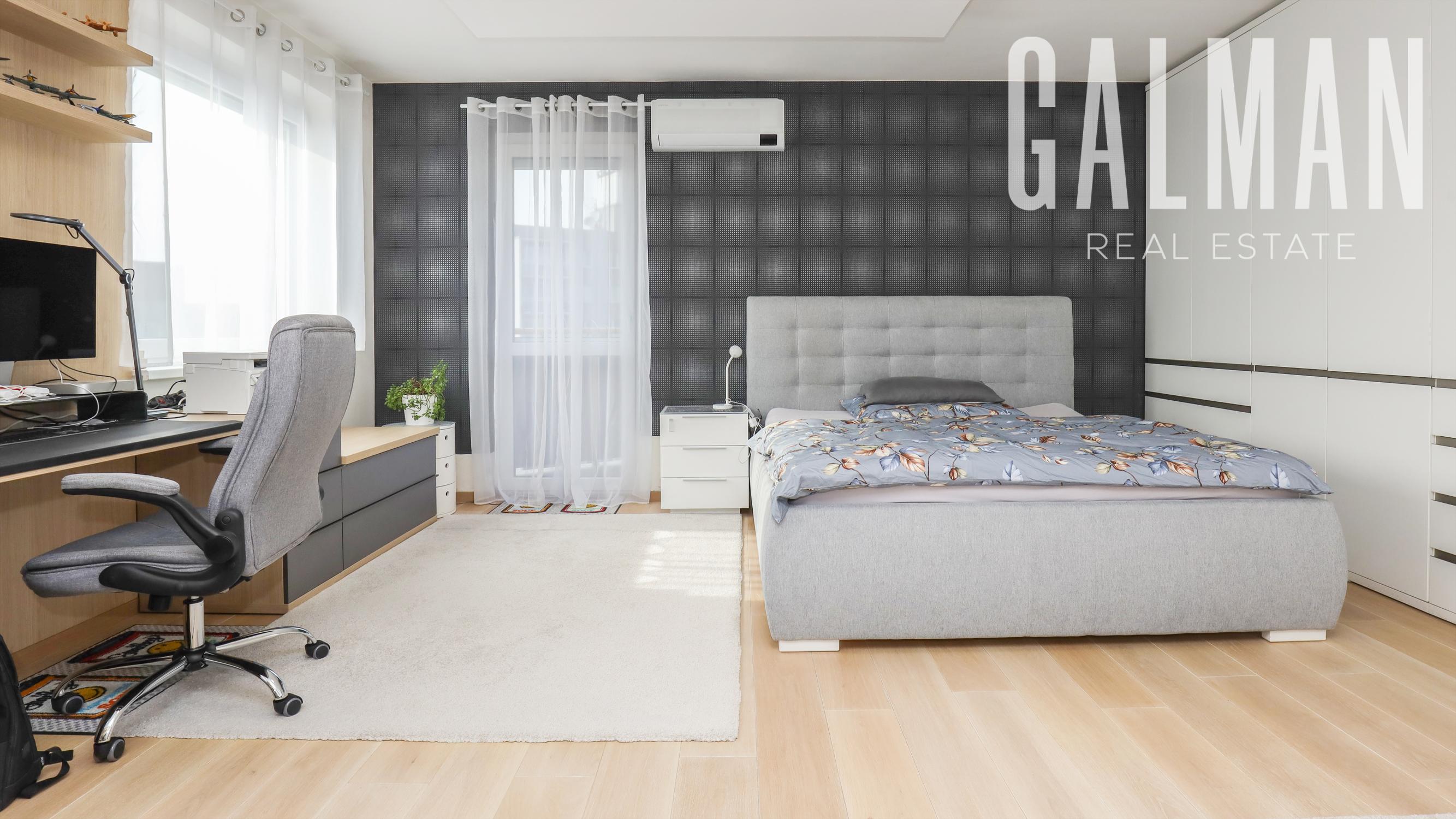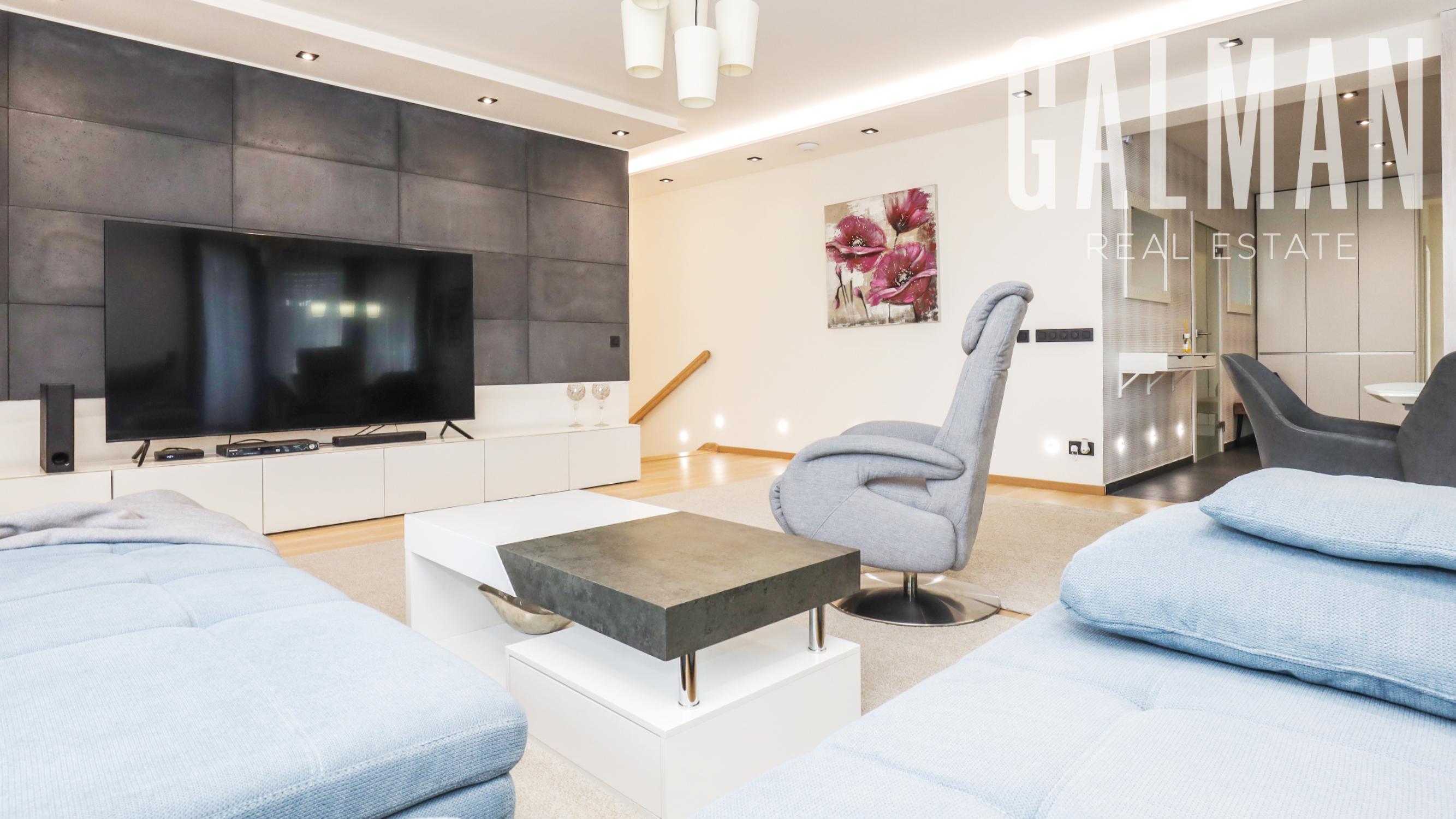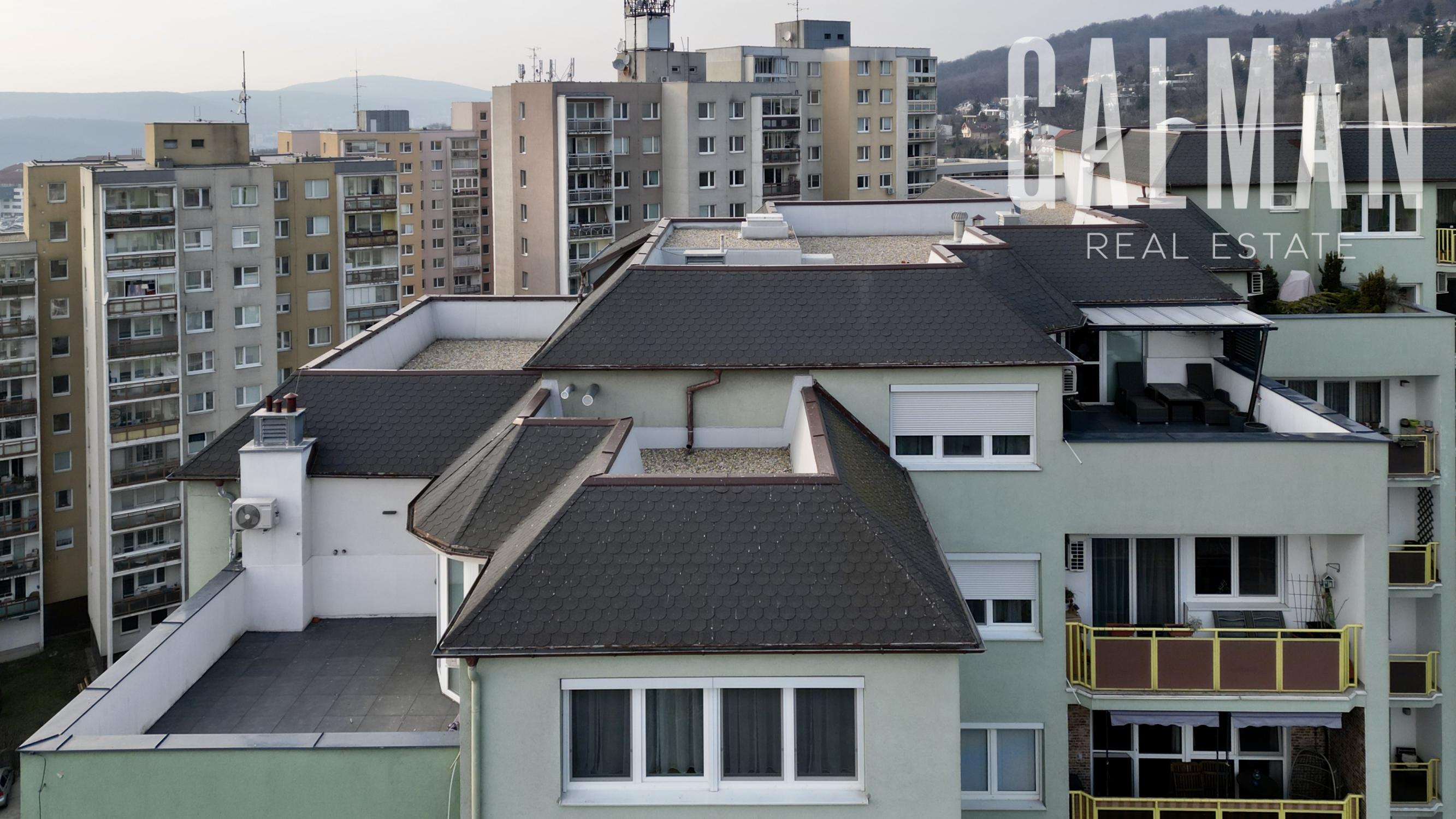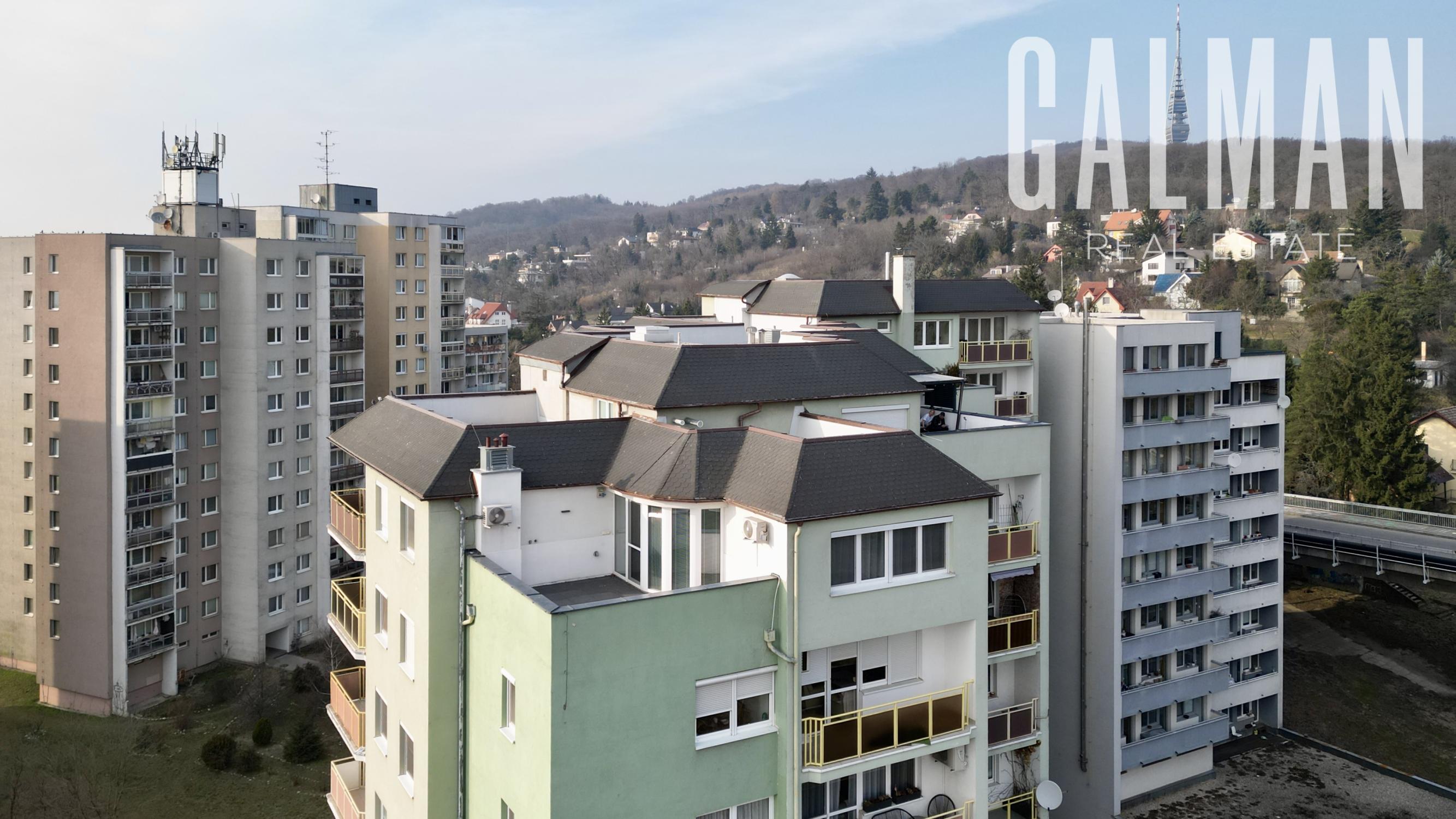 Spoločnosť GALMAN exkluzívne ponúka nadštandardný a veľkorysý 6 izbový penthouse s dvomi terasami a krásnym výhľadom na mesto vo vyhľadávanej lokalite Horné Kramáre pod Kolibským lesom. Tento veľkometrážny strešný byt s podlahovou plochou až 220 m2 a exteriérovou výmerou terás a balkónov spolu 57,5 m2 vznikol spojením dvoch bytov počas výstavby projektu. Je výnimočný tým, že je jediný na svojom podlaží a poskytuje tak maximálne súkromie s výhľadom na lesy Koliby a panorámu mesta.