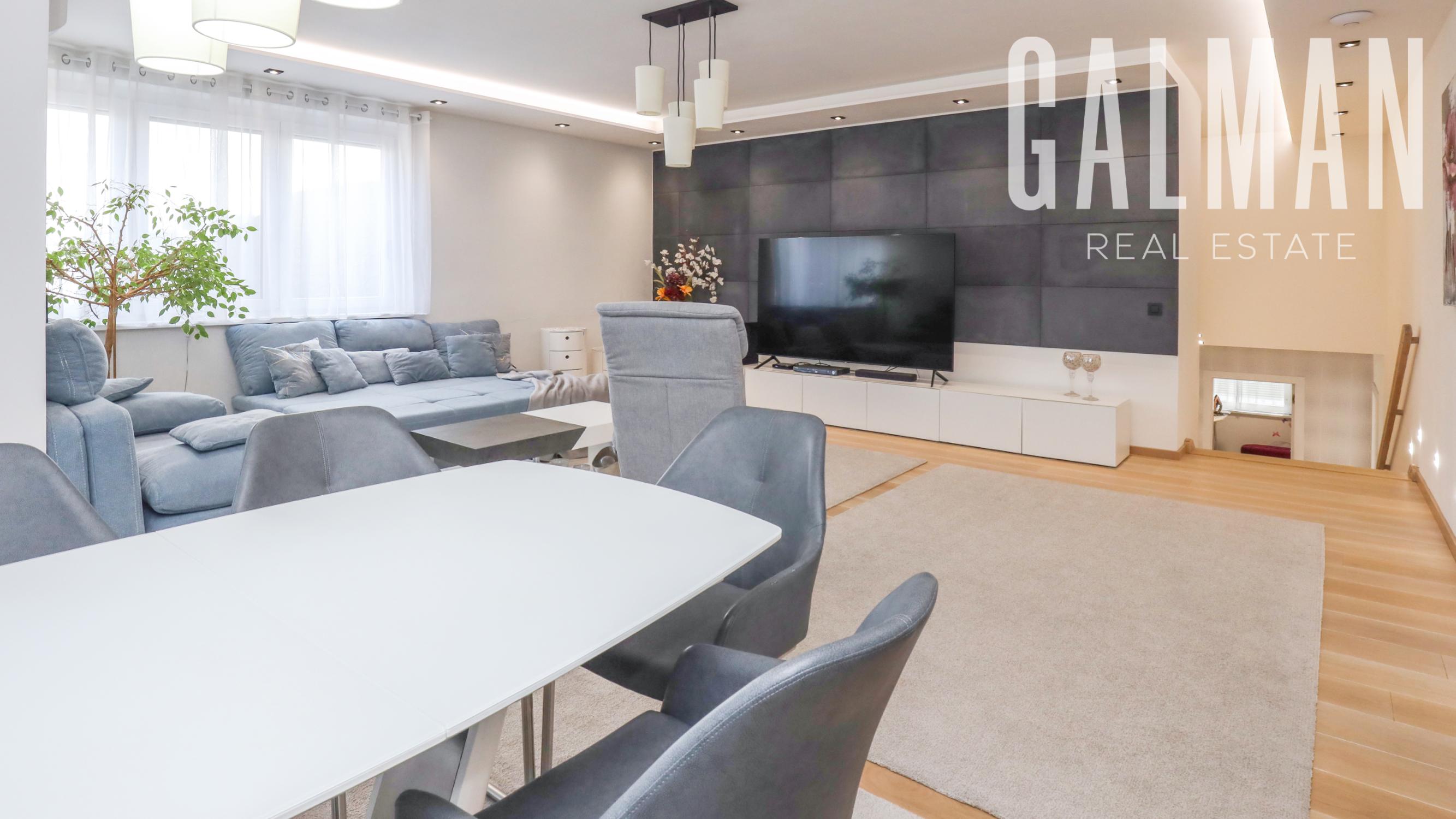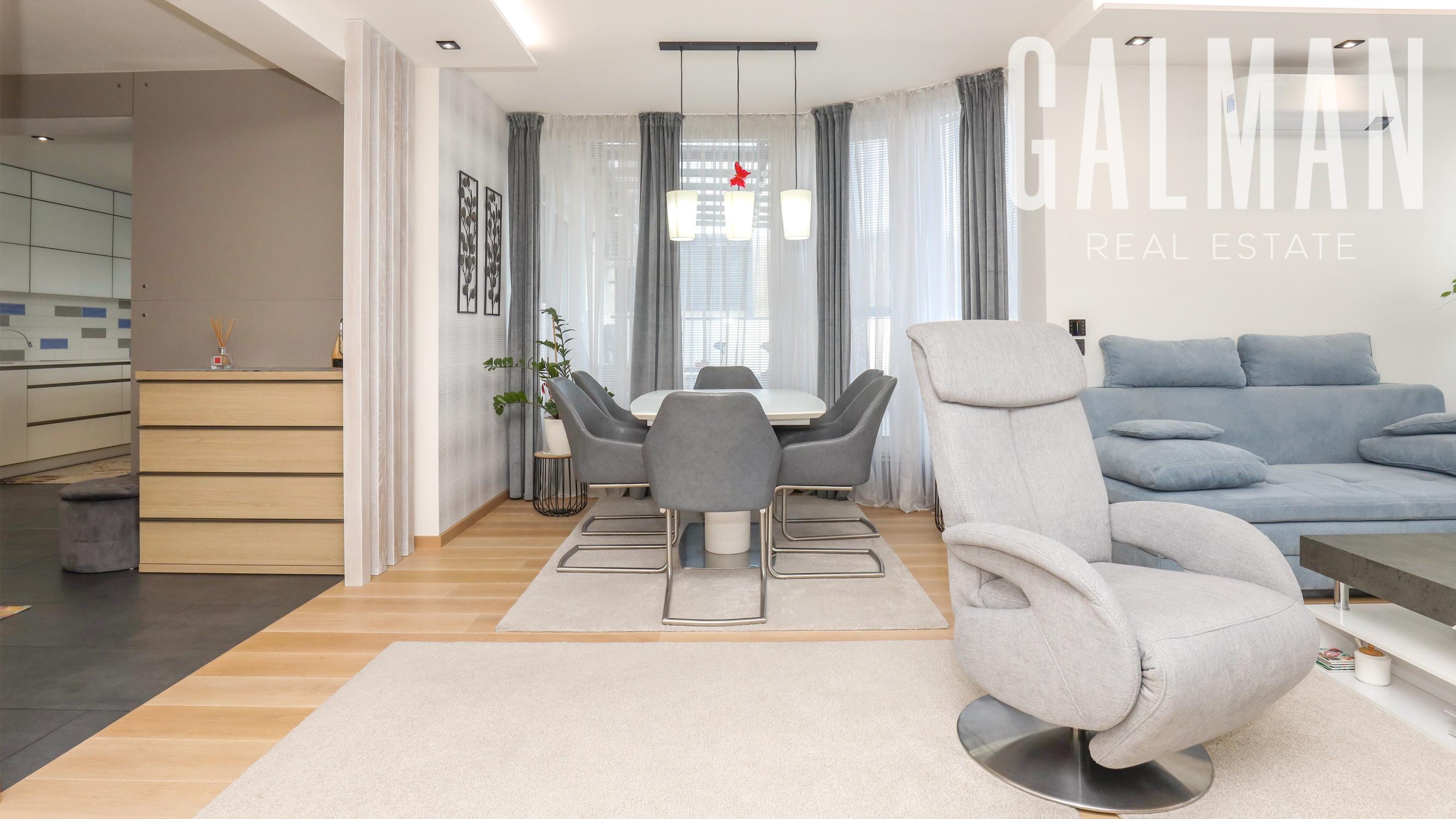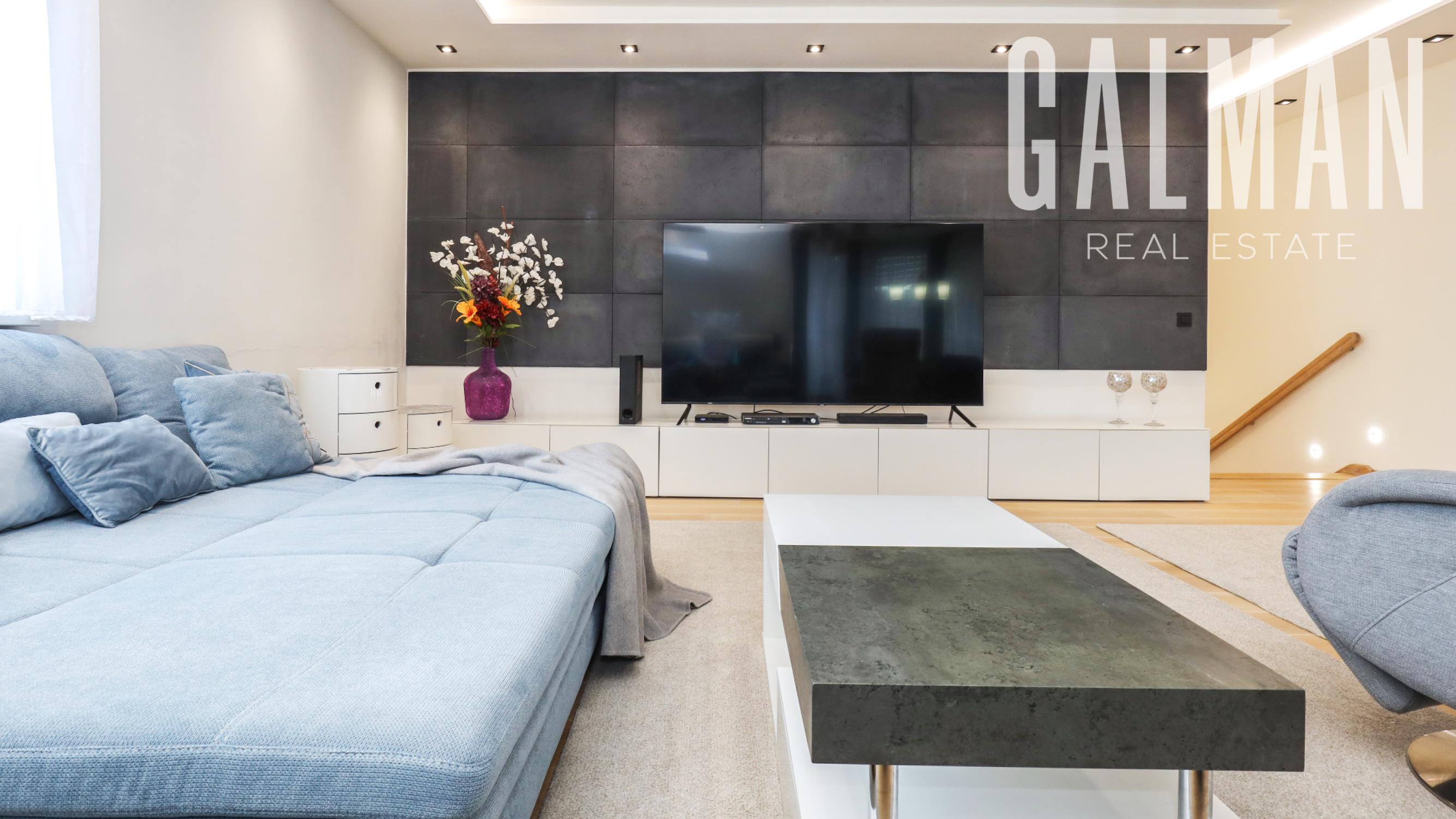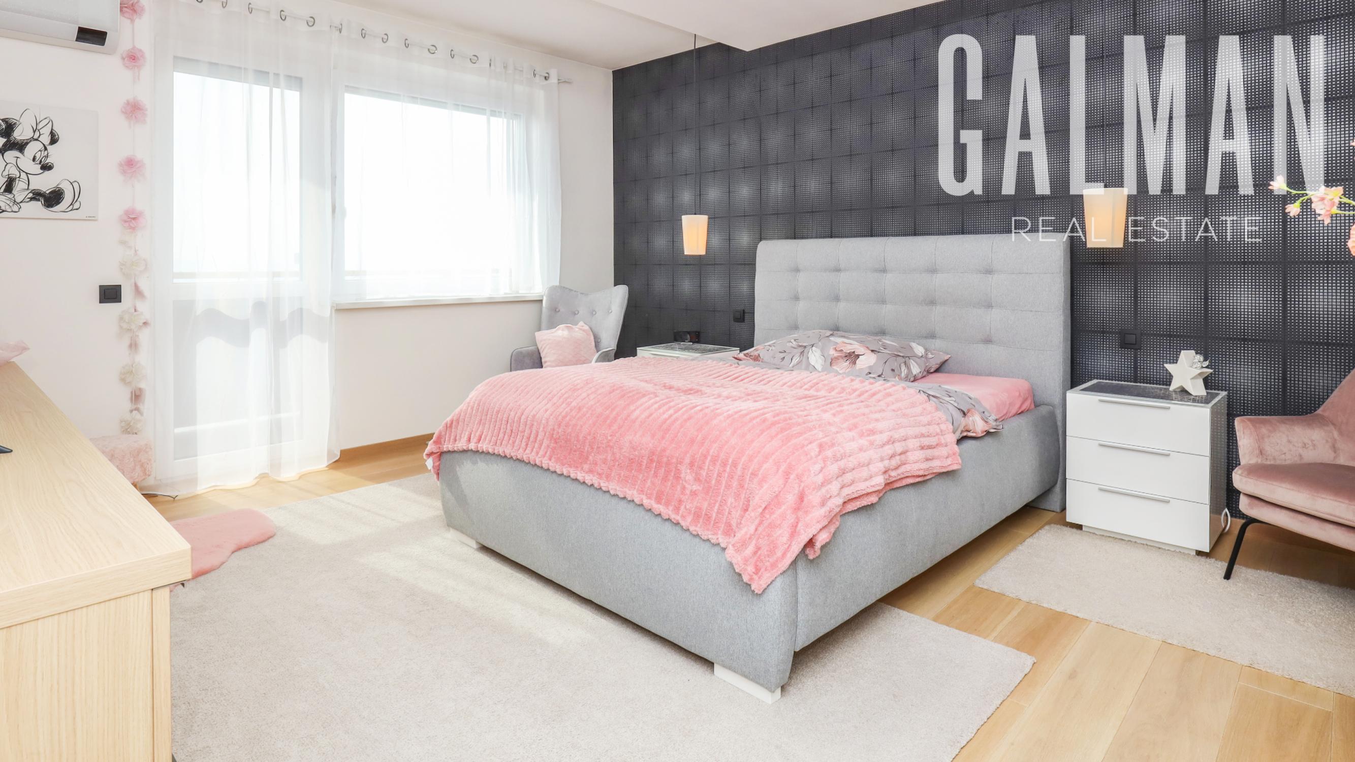 Spoločnosť GALMAN exkluzívne ponúka nadštandardný a veľkorysý 6 izbový penthouse s dvomi terasami a krásnym výhľadom na mesto vo vyhľadávanej lokalite Horné Kramáre pod Kolibským lesom. Tento veľkometrážny strešný byt s podlahovou plochou až 220 m2 a exteriérovou výmerou terás a balkónov spolu 57,5 m2 vznikol spojením dvoch bytov počas výstavby projektu. Je výnimočný tým, že je jediný na svojom podlaží a poskytuje tak maximálne súkromie s výhľadom na lesy Koliby a panorámu mesta.