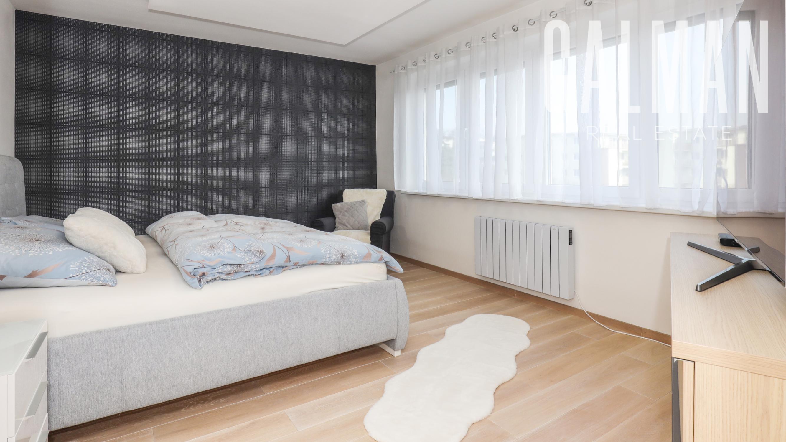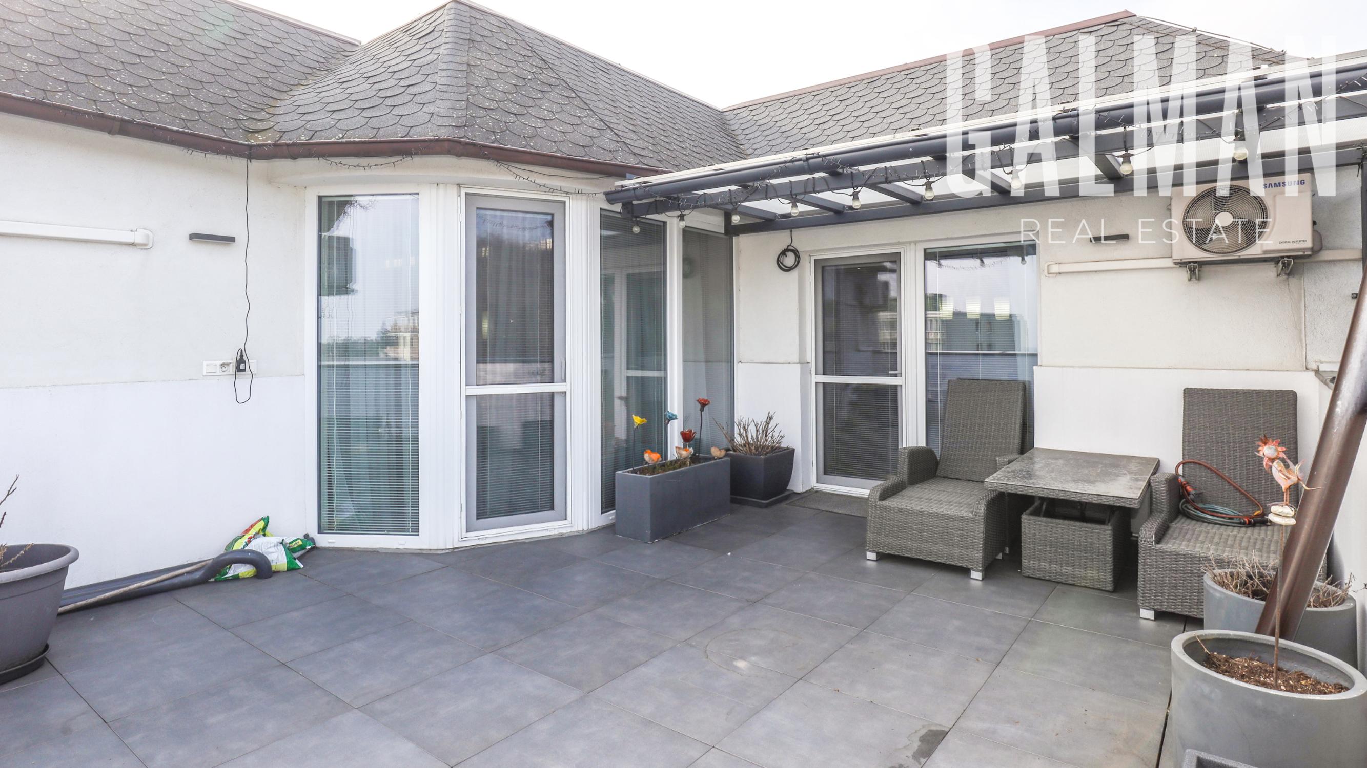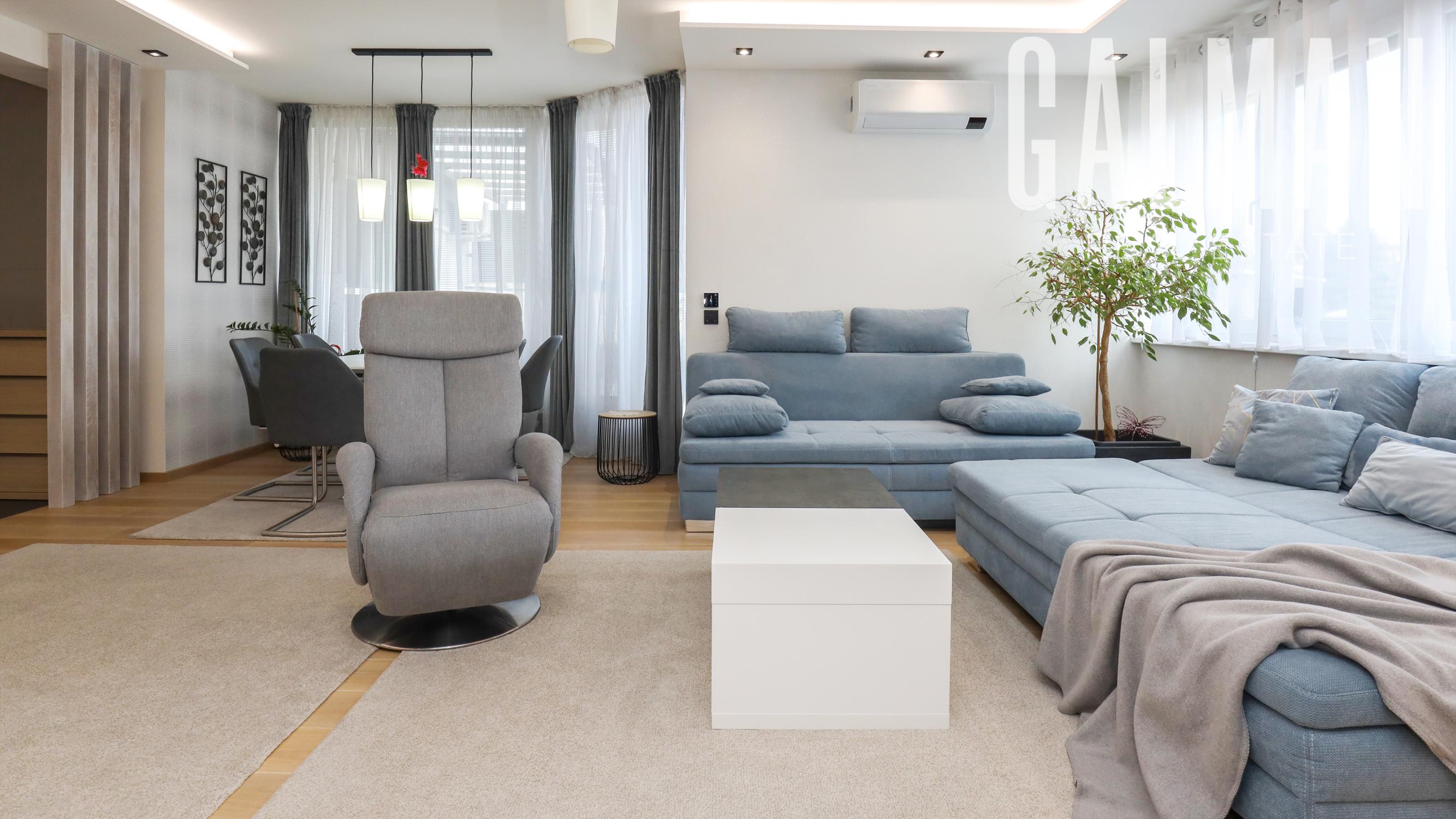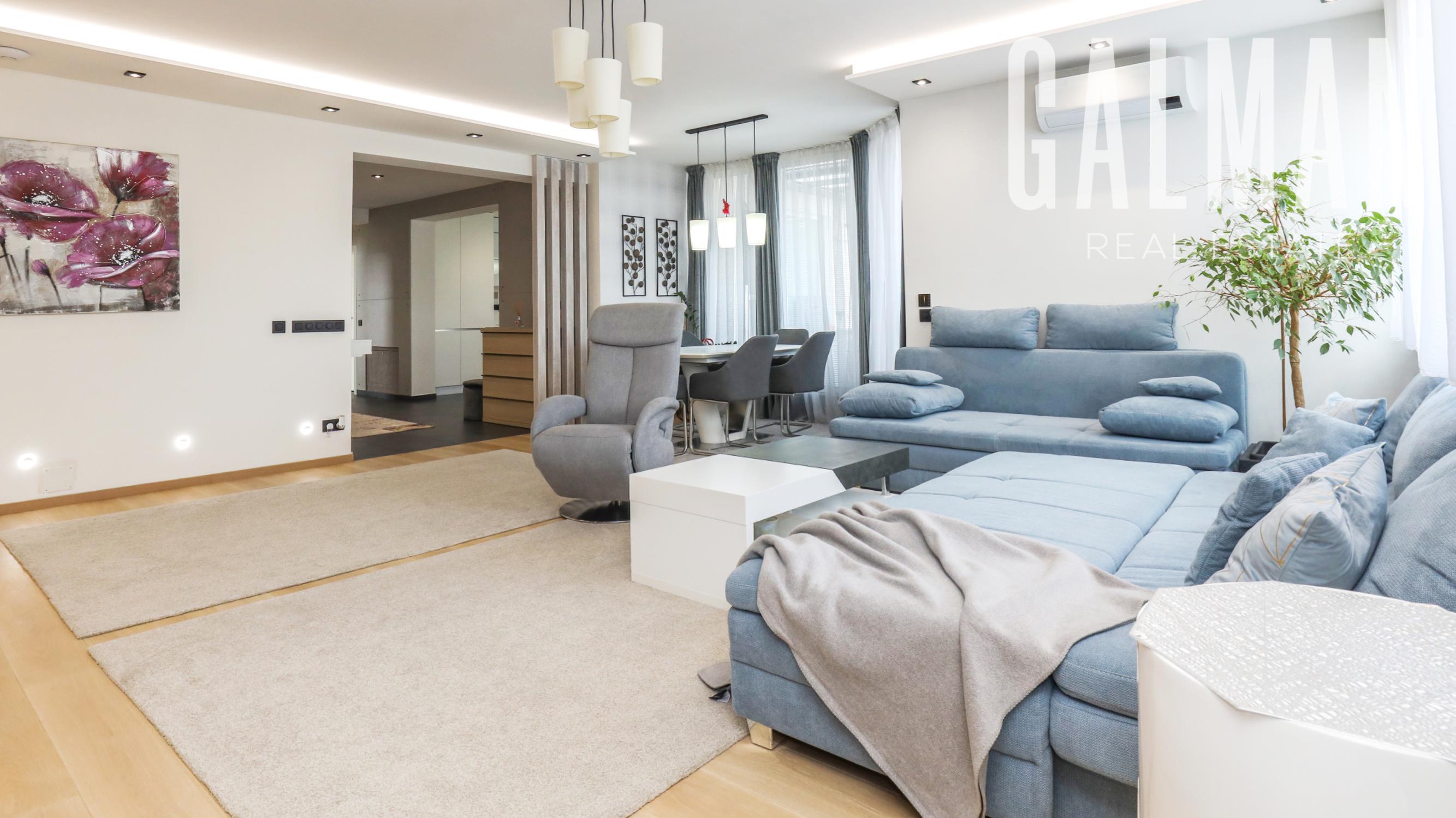 Dispozíciu penthousu tvorí menšia predsieň so vstavanou skriňou, vstupná hala, ktorá spája priestrannú dennú obývaciu izbu a samostatnú kuchyňu s komorou, pričom obe so vstupom na hornú terasu, a veľkú hosťovskú izbu s balkónom a vlastnou kúpeľňou. Z presvetlenej obývacej izby sa pol-úrovňovým schodiskom ďalej prepája nočná časť bytu tvorená 3 samostatnými spálňami a veľkým "walk-in" šatníkom, veľkou kúpeľňou a druhým šatníkom "walk-in", menšou galériou so vstupom na spodnú terasu. Byt má zabezpečené podlahové kúrenie novými spoločnými kotlami bytového domu, vstavaný nábytok na mieru, dizajnové osvetlenie so stmievaním, plastové 7 komorové okná a balkónové dvere zn. SCHUCO, elektrické vonkajšie rolety na diaľkové ovládanie, kompletne zariadenú kuchynskú linku so vstavanými spotrebičmi, v každej izbe klimatizácia Samsung, nové stupačky.. Prislúcha mu komfortná pivničná kobka a parkovacie státie v rezidenčnej garáži bytového domu, ktoré je možné dokúpiť za 20.000€. Nehnuteľnosť prešla v roku 2021 kompletnou modernou rekonštrukciou podľa dnešných trendov a predstáv náročného klienta.
