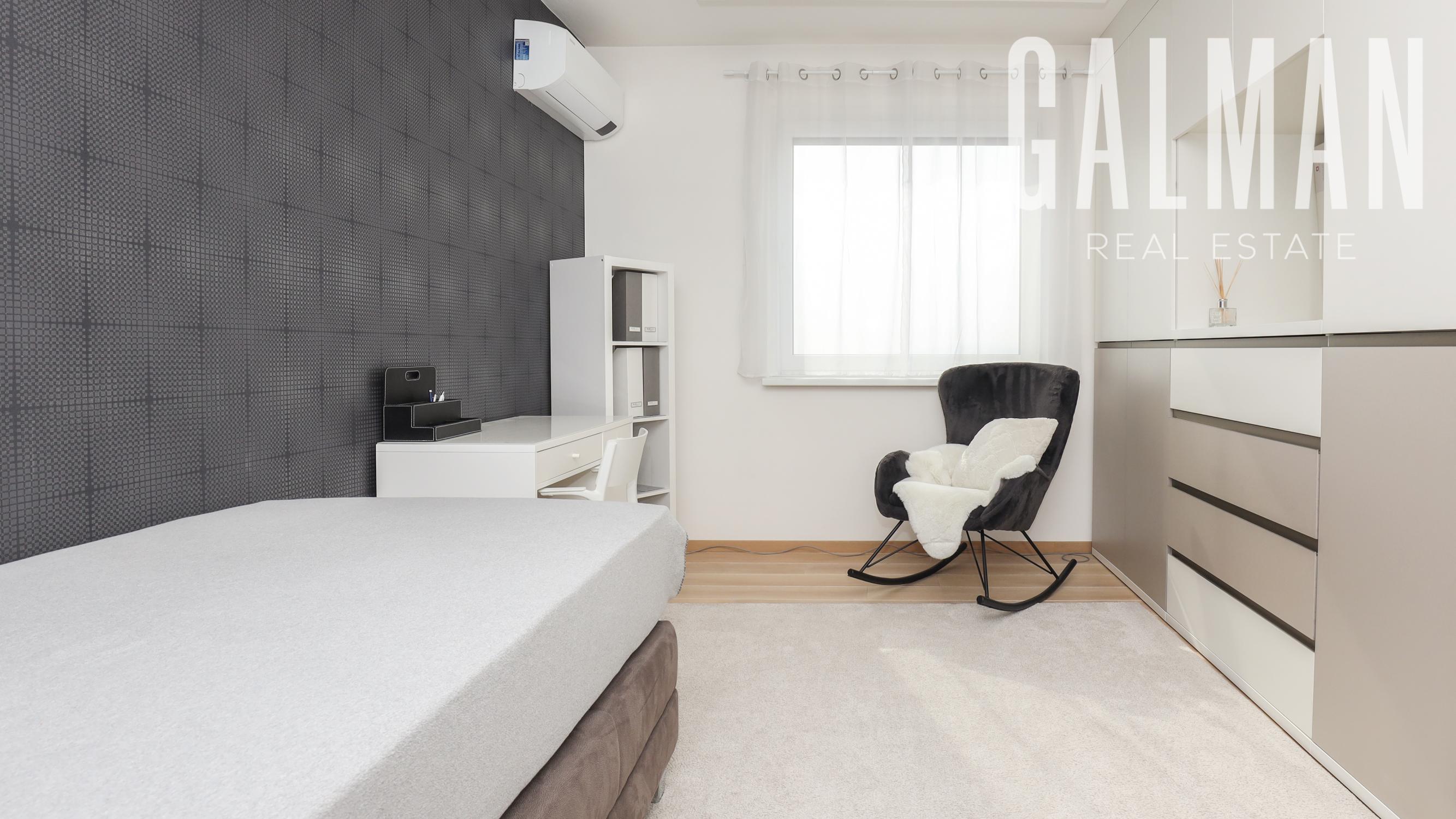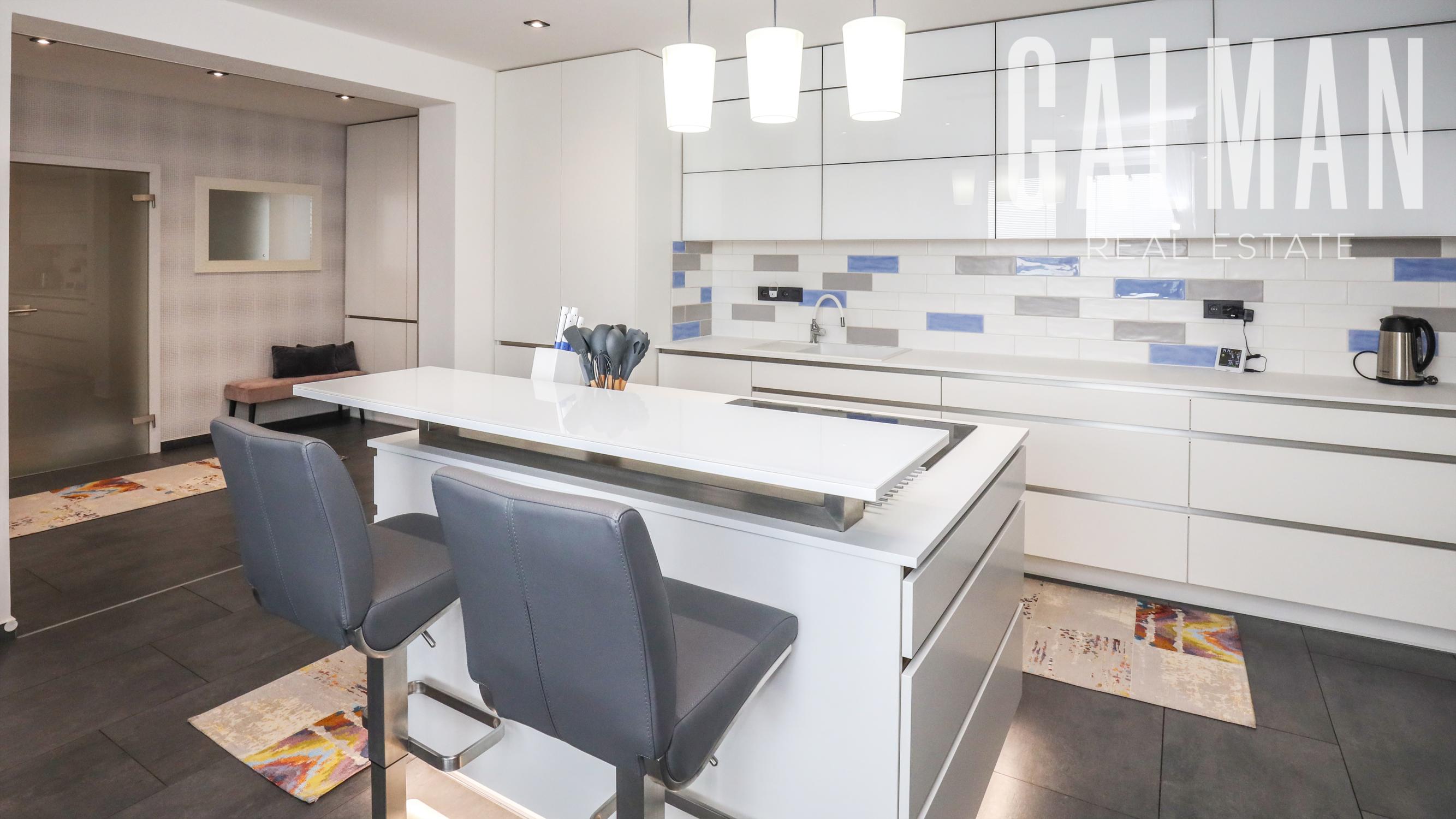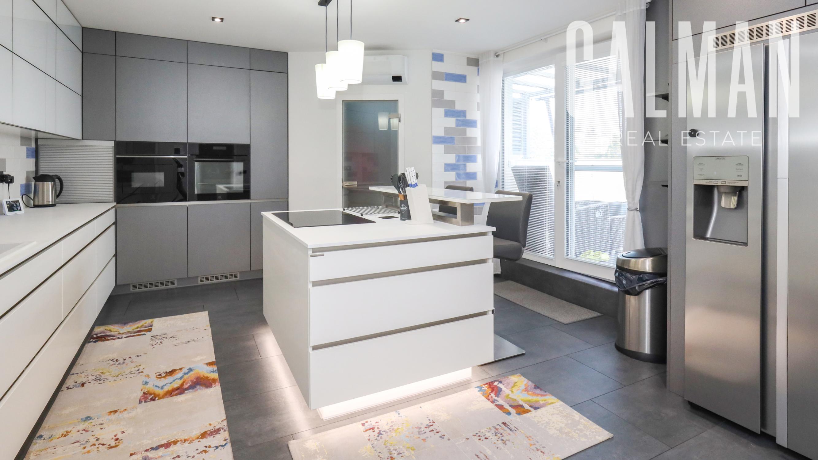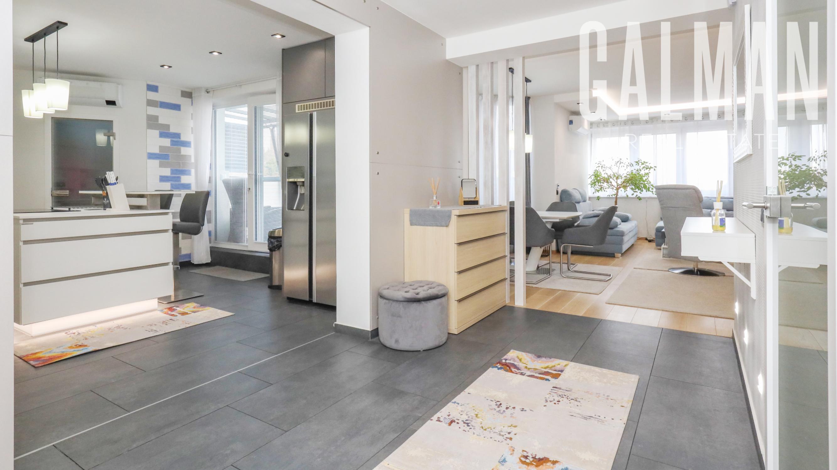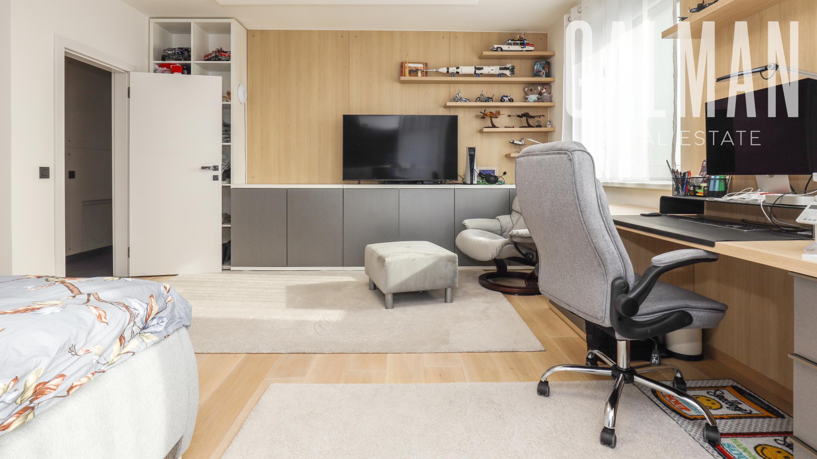 Dispozíciu penthousu tvorí menšia predsieň so vstavanou skriňou, vstupná hala, ktorá spája priestrannú dennú obývaciu izbu a samostatnú kuchyňu s komorou, pričom obe so vstupom na hornú terasu, a veľkú hosťovskú izbu s balkónom a vlastnou kúpeľňou. Z presvetlenej obývacej izby sa pol-úrovňovým schodiskom ďalej prepája nočná časť bytu tvorená 3 samostatnými spálňami a veľkým "walk-in" šatníkom, veľkou kúpeľňou a druhým šatníkom "walk-in", menšou galériou so vstupom na spodnú terasu. Byt má zabezpečené podlahové kúrenie novými spoločnými kotlami bytového domu, vstavaný nábytok na mieru, dizajnové osvetlenie so stmievaním, plastové 7 komorové okná a balkónové dvere zn. SCHUCO, elektrické vonkajšie rolety na diaľkové ovládanie, kompletne zariadenú kuchynskú linku so vstavanými spotrebičmi, v každej izbe klimatizácia Samsung, nové stupačky.. Prislúcha mu komfortná pivničná kobka a parkovacie státie v rezidenčnej garáži bytového domu, ktoré je možné dokúpiť za 20.000€. Nehnuteľnosť prešla v roku 2021 kompletnou modernou rekonštrukciou podľa dnešných trendov a predstáv náročného klienta.